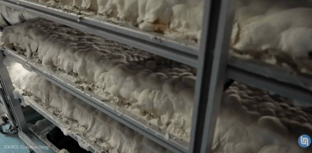 Those fibrous threads have an unsual property. Under controlled conditions, mycelium can be grown into almost any shape. It binds to agricultural substrates, forms composite structures, and produces a range of material properties depending on the species and the conditions you subject it to. Some produce dense, leathery sheets. Others generate foam-like, compressible structures with impressive load-bearing characteristics.