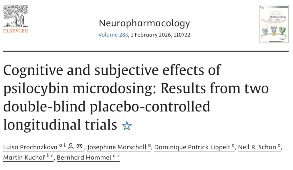 The study “Cognitive and subjective effects of psilocybin microdosing: Results from two double-blind placebo-controlled longitudinal trials” is published in Neuropharmacology, Volume 283, February 2026, by Prochazkova, Marschall, Lippelt, Schon, Kuchař, and Hommel.