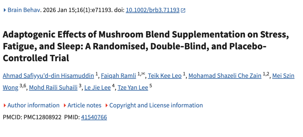 Study Reference: Hisamuddin, A.S., Ramli, F., Leo, T.K., et al. (2026). Adaptogenic Effects of Mushroom Blend Supplementation on Stress, Fatigue, and Sleep: A Randomised, Double-Blind, and Placebo-Controlled Trial. Brain and Behavior, 16(1), e71193.